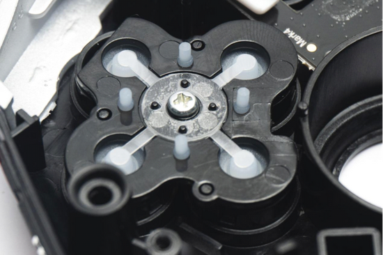 在机械微动的上方有一块用于提升手感的元件,它由缓冲胶垫+按键支架组成。硅胶垫被一层按键支架固定在上盖上保证了四个按键手感的一致性;然后再在硅胶垫上覆盖键芯、键帽,加上电路板和微动开关组成了共6层的机械按键结构。