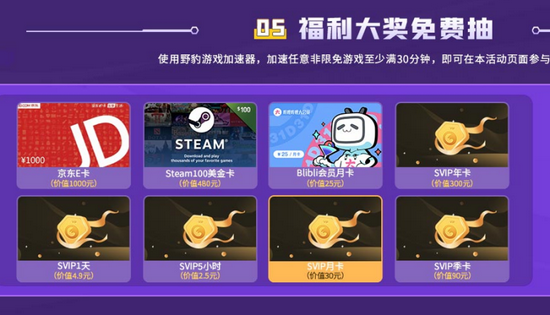 不仅如此,野豹游戏加速器还不按常理出牌地推出「官方一键白嫖指南」活动,全面介绍了所有可以免费获得SVIP的方式,教你一步一步薅羊毛,其中还有100%中奖的「福利大奖免费抽」环节!活动期间所有玩家每天都可以在活动参与抽奖,完全免费,奖品包括各种SVIP卡,B站大会员,Steam卡、京东E卡1000元等等,对于玩家来说是非常大的福利了!