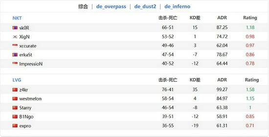 在首张地图Overpass上z4kr发挥出色,带领LVG在防守端取得11-4的领先,攻防互换后仅让NKT拿到一分就迅速将比赛结束。来到Dust2后sk0R完全觉醒,拿下30-16的恐怖KD,全场仅z4kr一人的数据可以与之对抗,最终NKT在进攻方以碾压之势赢下图二,比分16-11。在决胜图Inferno上手感正热的NKT在上半场仍然取得三分领先,来到下半场后LVG状态回暖慢慢追分,比赛局势逐渐陷入焦灼,最终NKT仍然更胜一筹,以16-14艰难战胜LVG赢下比赛。