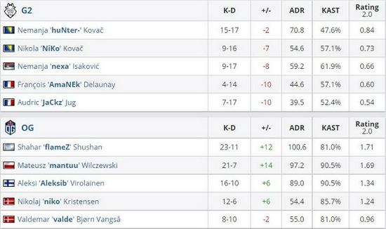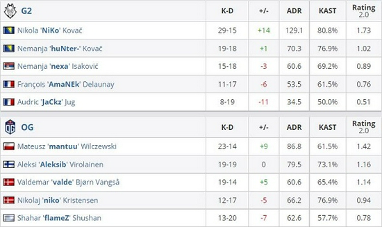 在首张地图Mirage上G2先以防守方开局,上半场Niko直接砍下21-6KD与151ADR带飞G2,成功取得9-6的领先,但在攻防互换后潮水褪去,G2的整体状态并没有那么尽如人意,反观OG一边多名选手发挥稳定,他们在防守端交出完美的答卷,仅让G2拿到一分就将比赛结束,最终以16-10完成大翻盘。