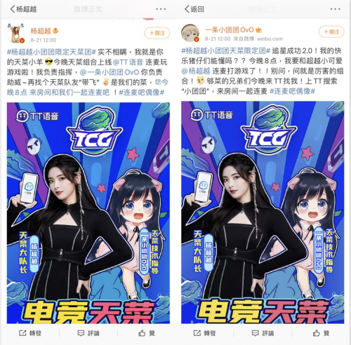 早在连麦前,TT语音官方便释出了杨超越宣布组建“电竞天菜俱乐部”的消息。杨超越化身“天菜大队长”、小团团担任“天菜技术指导”,在线招募队友一起连麦玩游戏。别具一格的招募活动激起网友的踊跃报名,纷纷直呼“太会玩”。微博相关热门话题总阅读量超1.8亿,讨论量超35万。