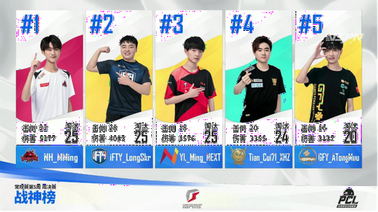 同样获得25个淘汰的还有iFTY战队的LongSkr和YLNEXT战队的Ming。前几届PCL的战神榜常客LongSkr本周重回榜单,并且拿到了全队近半数的淘汰。Ming则是带领YLNEXT战队拿到了本周的第五名,并险些在最后一局中逆转夺冠。此外,Tianba战队的Cui71与GFY战队的ATongMuu也再次登上了战神榜的宝座。