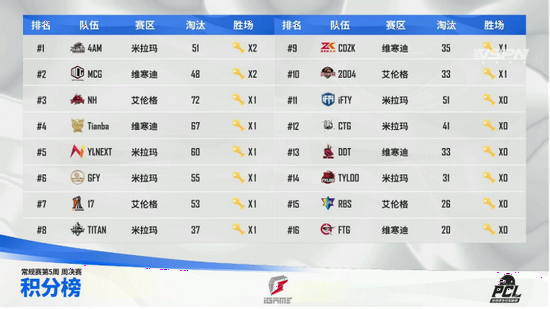 至此,常规赛的征程已经结束,晋级到季后赛的16支战队分别是NH、MCG、Tianba、4AM、17、YLNEXT、TYLOO、CDZK、iFTY、CTG、NanZ、GFY、TITAN、2004、PeRo、DDT。其中米拉玛赛区有7支队伍闯入季后赛,成为常规赛最亮眼的赛区。