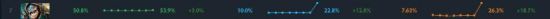 从笔者目前单排组排的经历来看,在7.30b更新前小鱼人几乎选不到,全英雄选择几乎必被ban,随机征召就会被双方第一轮选择顶掉,可以选到的机会很少。从数据层面来看(此处以超凡冠绝分段为例,数据来源为游戏内PLUS统计),小鱼人的胜率暴涨3.0%,笔者也看了其他分段的涨幅基本也都在3%左右,选择百分比也是陡增10%来到了22.8%,禁用率更是骤增7.63%来到了26.3%,可见其目前在路人局的火爆程度。