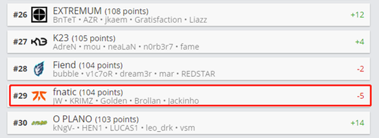 在最新一期的HLTV世界排名的榜单上,fnatic的排位已经跌落至榜单创立以来的历史新低,第29位。排名是目前状态最好的体现,这支队伍在最近的一系列比赛中表现出来的低迷的竞技状态和他们的历史地位不相符合。