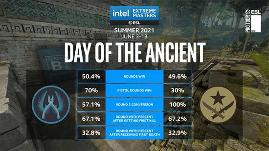 本次的IEM 2021夏季赛是Ancient作为新现役地图的首秀。赛事主办方IEM公布了小组赛阶段Ancient的各项相关数据。