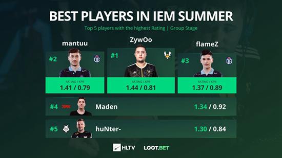 OG在本次赛事中表现出色,两位选手mantuu和flameZ火力全开,占据了二、三位;“玛雅遗民”Maden的KPR是五位选手中最高的,达到0.92,他同时拥有数据板最高的ADR(98.2)和影响力Rating(1.57),遗憾的是他的队伍止步小组赛;而G2的优异表现同样离不开huNter-的精彩发挥。