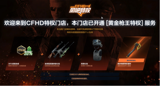 来网鱼网咖可抢先体验CFHD全新网吧特权:全原型武器免费体验、30%网吧经验加成、防具套装免费体验(含防弹衣+防弹头盔)。