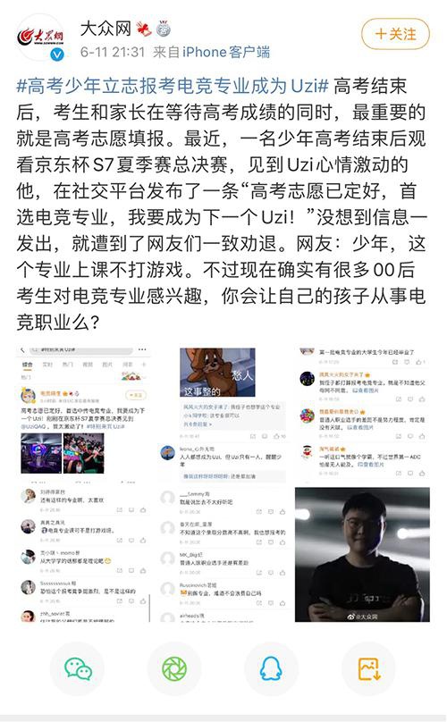 “很多高考学生对电竞专业有误解,觉得报了这个专业,就一定能成为Uzi一样的选手,其实职业电竞选手成才率非常低,人人都想成为Uzi,但Uzi只有一个。”一名网友留言说道。