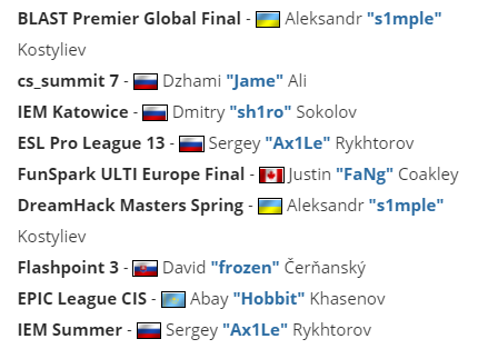Ax1Le击败了总决赛对手OG的mantuu以及自己的队友sh1ro获得本次比赛的MVP,在总决赛的三张地图上,Ax1Le均是rating第一和场均伤害第一。三月初的EPL S13,Gambit虽不敌Heroic获得亚军,但Ax1Le仍然凭借其完美的发挥收获了第一个MVP。随着Ax1Le在本次IEM夏季赛拿到第二个MVP,其MVP数已经超过了sh1ro,与今年同样两项MVP奖项加身的s1mple比肩。