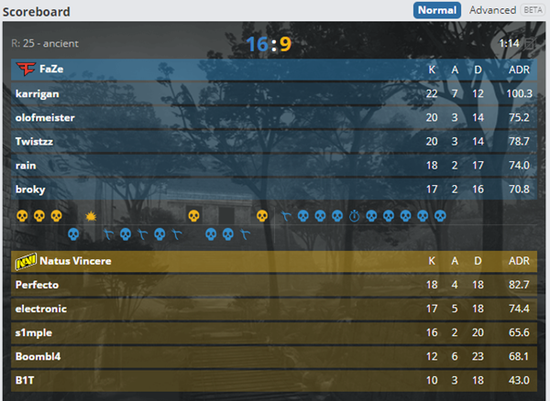 FaZe显然精心准备了这场比赛。他们在第一张大图中选择了 “整活”专用图Ancient,尽管他们当T时以6:9落后,但是在CT方FaZe以精妙的战术安排打得NaVi找不着北,没有让NaVi拿到哪怕一分。其中,10小局中有8局将NaVi全歼。