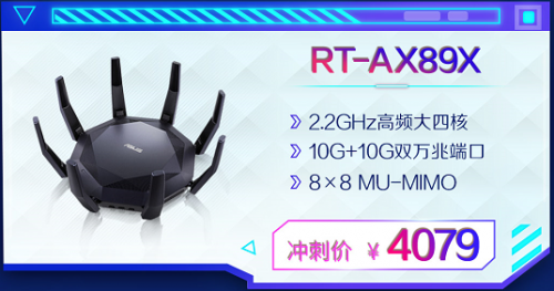 华硕RT-AX89X电竞游戏路由,王者风范,皇冠加冕, 618冲刺价只需4079元,限时送399元双肩包。它拥有博通4核2.2G战芯,性能澎湃,稳如泰山;突破性8*8MU-MIMO+12条数据流,海量传输;双10G端口,千兆网口×8,气吞山河;全顶级性能,让用户战无不胜,所向披靡。