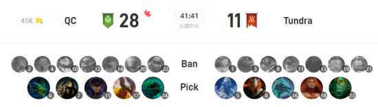 第二局比赛,Tundra拿出了远古冰魄、帕克、司夜刺客、伐木机和噬魂鬼,QC拿出了幽鬼、灰烬之灵、大地之灵、幽鬼和冥界亚龙。