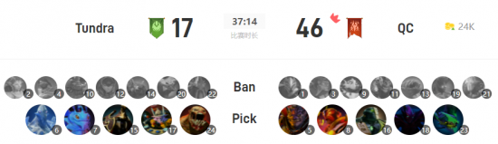 34分钟,QC再进天辉的上路野区,虽然Tundra意识到了野区有点不对劲,但是QC还是成功击杀了远古冰魄和司夜刺客,这两个辅助在幽鬼和灰烬之灵的面前毫无还手的能力。Tundra交出多人的买活才勉强将QC击败,随后Tundra准备控盾但被买活的灰烬之灵干扰,即便噬魂鬼拿到不朽之守护但Tundra还是不敌QC输掉了团战。
