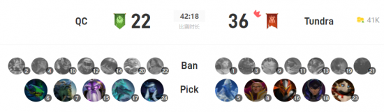 第一局比赛,QC拿出了冥界亚龙、小小、虚无之灵、寒冬飞龙和卓尔游侠,Tundra拿出了远古冰魄、祈求者、龙骑士、露娜和发条技师。