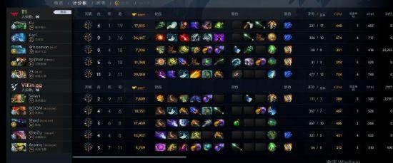 对线期结束,T1落后了Vikin.gg不到1k的经济,所幸幽鬼的后期强度要略高露娜一筹。中期幽鬼快速发育在27分钟就近乎成型。