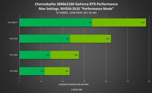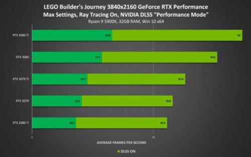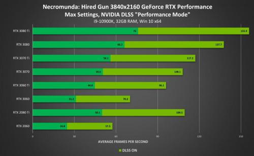 在4K分辨率下NVIDIA DLSS带来2倍的性能提升,使所有GeForce RTX 30系列GPU玩家都能以60+FPS的帧率畅玩游戏。