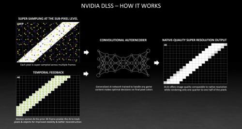 一个特殊类型的AI网络,称为卷积自动编码器,利用低分辨率的当前帧、运动矢量和高分辨率的前一帧,逐像素地确定如何生成高分辨率的当前帧。