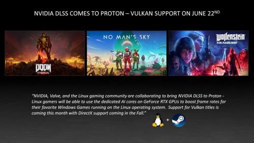 明天,NVIDIA DLSS将在Proton上为Vulkan API游戏提供支持,使Linux玩家能够使用其GeForce RTX GPU的专用于AI加速的 Tensor Cores来提高《毁灭战士》(DOOM)、《无人深空》(No Man’s Sky)和《德军总部:新血脉》(Wolfenstein: Youngblood)的游戏帧率。今年秋季,将通过Proton为DirectX游戏带来DLSS增强。