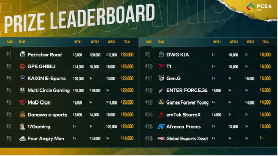 在拿下第二周周冠后,PeRo战队的总奖金池跃居至23000美元,位列榜首。但这一成绩并未与其他战队拉开较大差距,理论上有希望争冠的队伍更是多达12支。两周的季军得主MCG战队与首周周冠KX战队均以20000美元奖金紧随其后。来自PWS赛区的GBL战队凭借出色的作战能力收获19000美元,也是冠军的有力争夺者之一。这四支队伍若获得第三周周冠,即可锁定总冠军,因此PeRo战队捍卫榜首宝座的难度可谓不小。
