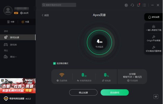 奇游电竞加速器是《APEX英雄》最好用的加速器,支持全区服加速,各区服网络服务质量进一步调优,延迟通通降低50ms起,并且能有效避免掉线、丢包、卡顿等问题,各位可以用换取的周卡试试效果: