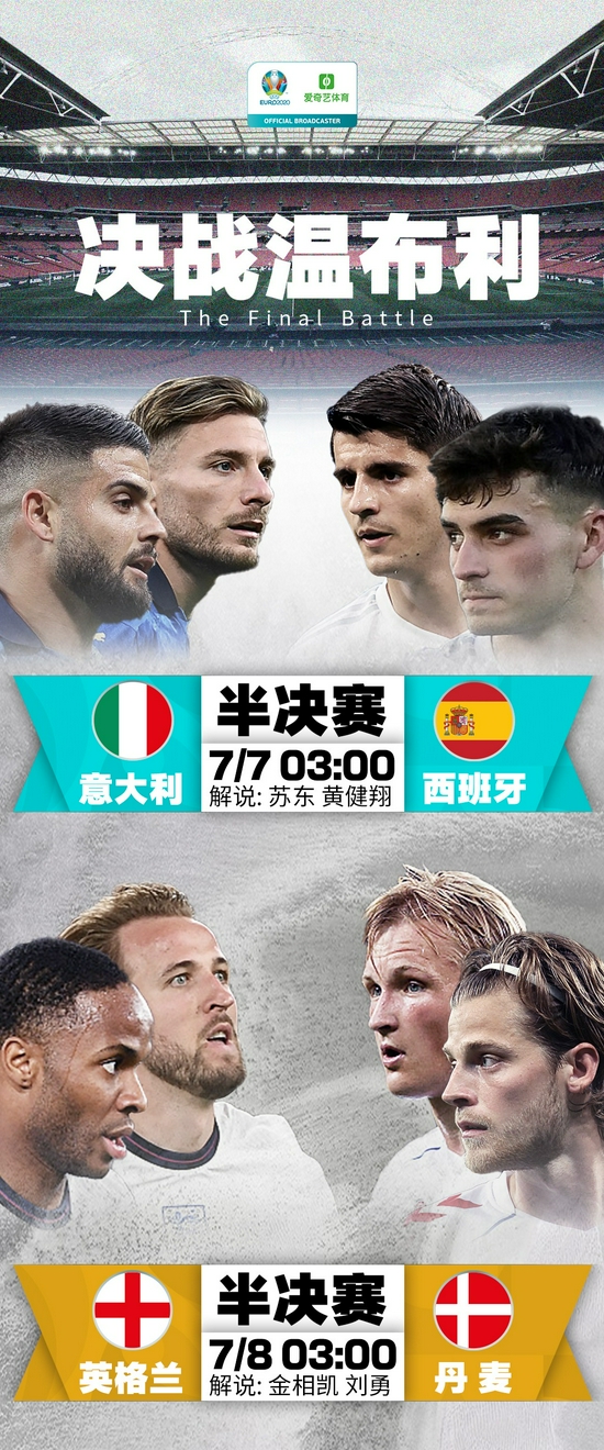 阔别五年的欧洲杯正在如火如荼上演,半决赛将于7月7日凌晨在英国伦敦的温布利球场展开首场对决,意大利和西班牙两支传统强队连续4届在淘汰赛相遇,意大利目前豪取五连胜,已32场不败,势头正劲。西班牙近两场淘汰赛都踢了加时赛才涉险过关,究竟谁能再往前走一步?而另外一场英格兰对阵丹麦的半决赛在网友中呼声更高,一面是状态爆棚主场作战的英格兰,一面是空前团结的丹麦童话,究竟谁能挺进决赛,答案即将于明晚揭晓。