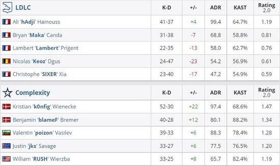 双方在首张地图Dust2上开战,Col作为防守方率先进入状态并取得8-1的优势开局,随后LDLC中期发力打出一波6连胜小高潮,不过上半场Col仍然以一分的微弱优势领先。来到防守方后hAdji手感渐入佳境取得137.6的ADR,但这终究不是一个人的游戏,Col在k0nfig与RUSH二人的联手发挥下以16-13赢下图一。