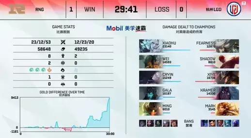第二局:前期LGD上路成功拿下两个人头,但RNG收下两条小龙。22分钟双方中路交战,Cryin妖姬极限操作,RNG成功打出0换4,拿下大龙和水龙魂领先巨大!27分钟RNG带着大龙BUFF中路推进,强势打出0换5,一波拿下比赛!
