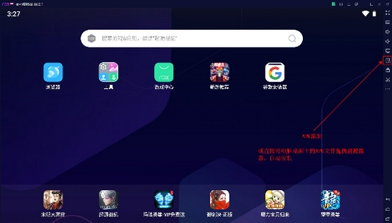 2.下载安装完成后,打开模拟器,在夜神应用中心搜索”英雄联盟手游”进行安装下载;或者是在夜神游戏中心网页下载安卓版“英雄联盟手游”apk文件,在夜神模拟器右侧栏安装按钮打开即可进行apk文件安装。