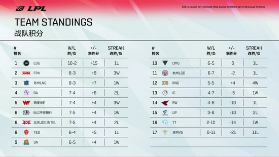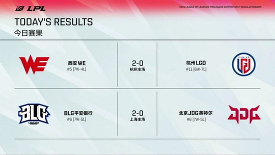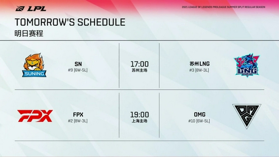 昨日比赛中WE和BLG彰显了在常规赛后期的强大稳定性,现在看WE的积分只要后面几场不出现连败,那么进入季后赛还是板上钉钉的!但是下一场比赛WE将与榜首EDG进行同台较量,御三家之争!今日比赛松宝回归首发,想必是已经恢复好身体状况了。LNG和SN进行较量,Ale和Bin对位。FPX和OMG中Doinb和小奶油对位,期待新人小将的发挥。