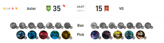 31分钟,Aster在击杀了育母蜘蛛和圣堂刺客以后平推中路,VG企图防守但森海飞霞与发条技师双双阵亡,Aster同时推进中路与下路攻破了VG的兵营。
