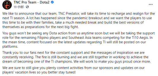 我们宣布,我们团队-TnC将花费一定的时间为下一个Ti赛季重新调整充电。自从疫情爆发以来发生了很多的事情,我们希望选手能利用这段时间多陪陪家人,并把自己调整到最好,为下一场大战做好准备。