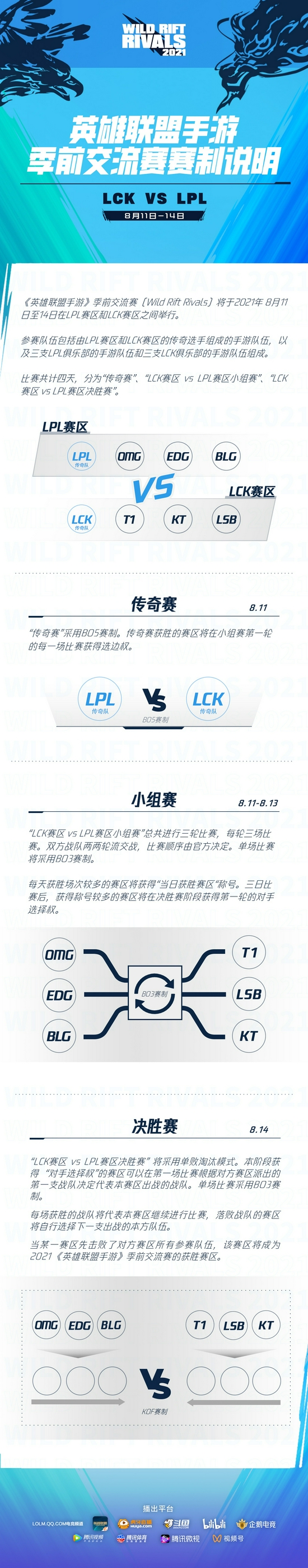 8月14日举办的“LCK赛区vs LPL赛区决胜赛”将采用BO3+单败淘汰模式,即从首轮比赛起,每轮BO3的获胜战队将代表赛区继续比赛,落败方则自行选择下一支出战队伍,当某一赛区率先击败对方赛区所有队伍,则该赛区成为2021WRR的最终获胜赛区。