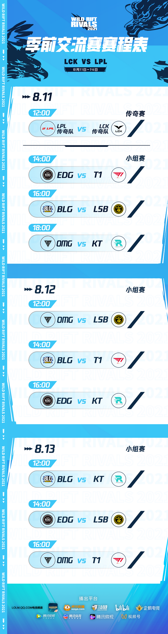 8月11日举办的“传奇赛”共一场,将邀请Flame、Helios、Ganked by Mom、Cpt Jack、MadLife五位LCK赛区传奇选手以及Moyu、LOVELING、Misaya、XuanXuanPi、ColiN五位LPL赛区传奇选手,采用BO5赛制展开交流,获胜方将为其代表赛区赢得小组赛首轮每一场比赛的选边权。