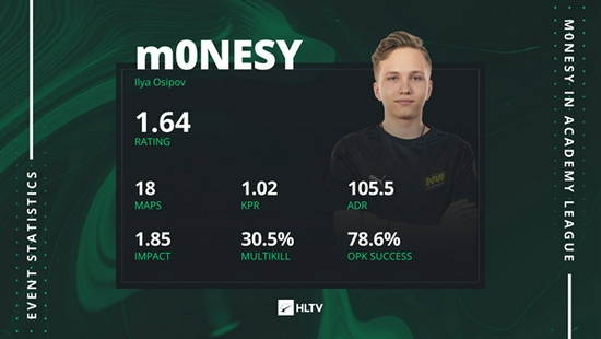 这场原本稀松平常的比赛因为NaVi小将m0NESY的出现成为各大海外论坛的谈资,这位年仅16岁的选手在本次比赛中发挥出色,展现出高出其他选手一等的实力。m0NESY在这次比赛中贡献出了现象级的数据,1.70的Rating,108.4的每回合伤害,35.5%的多杀率,每回合1.06个击杀以及每回合0.55次死亡,可以说m0NESY把NaVi Junior只手扛在了肩上走。