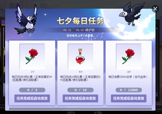 8月12日服务器维护后~9月2日上午7点玩家可以参与活动,活动全部以账号为单位进行。每日完成3场比赛可以领取爱之玫瑰*1。每日完成10场比赛可以领取爱之灵药*5。每日消费15000点券(含代金券)可以领取爱之玫瑰*4。以上任务每日只可完成一次。比赛:正常结算的3V3匹配赛、俱乐部联赛。每日7点刷新任务。