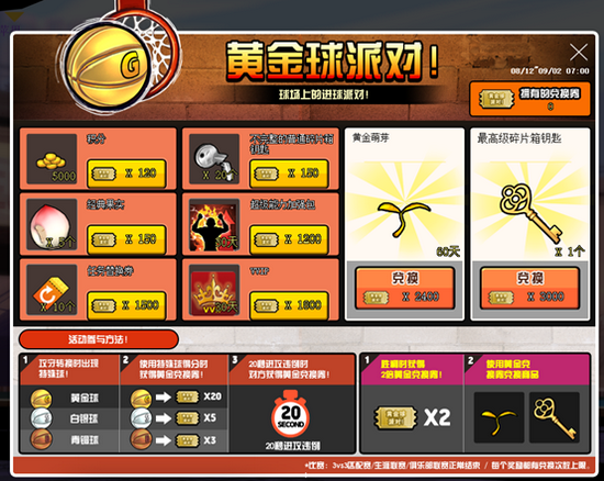 8月12日服务器维护后~9月2日上午7点玩家可以参与黄金球派对活动,攻守转换开球时概率出现特殊球。使用特殊球得分时获得黄金兑换券。持有黄金球,出现20秒违例时,对方获得黄金兑换券。胜利时获得两倍黄金兑换券。黄金兑换券可兑换活动商品。每个奖励都有兑换次数限制。3V3匹配赛/俱乐部联赛中才会出现特殊球。