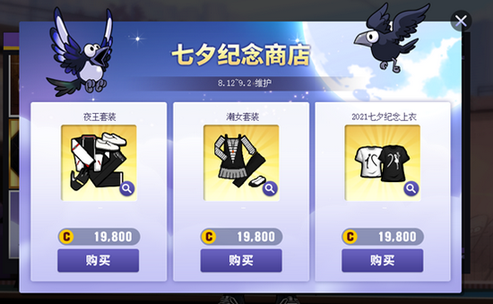 8月12日服务器维护后~9月2日上午7点活动开启后,玩家可在活动面板购买两款经典服装道具和七夕限定服装。夜王套装仅限男性角色使用,潮女套装仅限女性角色使用。两款套装为商城套装能力,不可拆分选择能力。购买后进入账号转送,转送有效期30天。