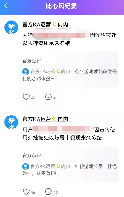 作为电竞产业衍生新业态,这并不是比心首次进行针对外挂违规行为的整治行动。经了解,在比心平台专设有名为“比心风纪委”版块,用于公示包括代练/宣传使用外挂等在内的违规处罚行为。据用户反馈,比心平台规则一直非常严格,尤其对于使用外挂或者代练等行为更是不能碰的红线。