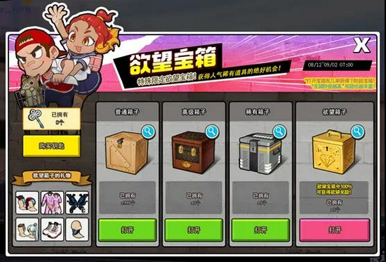 8月12日服务器维护后~9月2日上午7点期间,玩家购买钥匙打开宝箱,打开宝箱有几率获得下阶段的宝箱。宝箱阶级越高奖励也越丰富。有机会获得各种稀有道具。