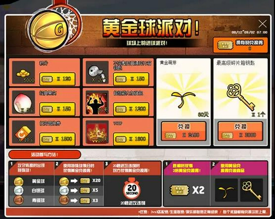 8月12日服务器维护后~9月2日上午7点期间,攻守转换开球时概率出现特殊球。使用特殊球得分时获得黄金兑换券。持有黄金球,出现20秒违例时,对方获得黄金兑换券。胜利时获得两倍黄金兑换券。黄金兑换券可兑换活动商品。每个奖励都有兑换次数限制。3V3匹配赛/俱乐部联赛中才会出现特殊球。