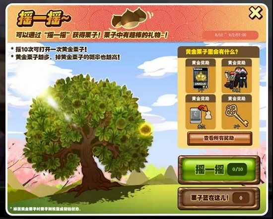 8月12日服务器维护后~9月2日上午7点期间玩家可以在活动界面通过“摇一摇”获得栗子。每个栗子中都有道具奖励。摇满10次就可以开出黄金栗子。黄金栗子越多,摇下黄金栗子的概率也越高。摇掉落黄金栗子将必定获得黄金道具。摇下黄金栗子,栗子树就会回到初始状态。