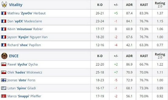 攻防互换后ENCE在输掉手枪局后完成强起翻盘,随后ENCE稳步追分并将分差缩小至一分,关键局apEX单人摸中抓住关键时机偷掉主B CT,ZywOo更是豪取三杀确立胜局。抢先拿到赛点的Vitality在之后的几个回合中率掉首杀,双方战至15-14。常规赛最后一分,法国人直接不讲武德一波中路枪法对抗将ENCE的防线完全击溃,最终Vitality以16-14赢下图一。