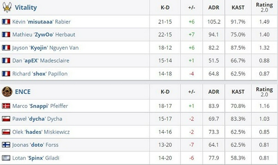 Vitality 2-0 ENCE(Mirage 16-14;Overpass 16-8)