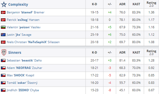 EPL S14 B组小组赛,Complexity对阵Sinners,上一场表现出色的捷克人这一场也和Complexity打得有来有回,两张图他们都有获胜的机会,但是在机会把握的能力上还是略逊一筹最终被coL击败。