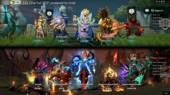 首局比赛SG拿出5号位全能骑士搭配斯温、沙王以及斧王3名力量核心,4号位上补出米拉娜。帝国则选到了与首轮比赛中击败液体全能斯温组合时几乎完全相同的阵容,噬魂鬼、暗夜魔王、撼地者以及巫妖没有变化,中单则是换成了殁境神蚀者。