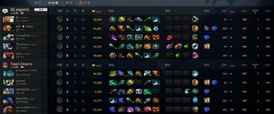 本局比赛双方前期十分焦灼,6名核心的经济一直咬的很紧。直到SG沙王斧王双双做出跳刀之后,SG主动进攻取得了比赛的主动。团战的胜利也解放了斯温的刷钱空间,斯温进入狂暴刷模式,很快经济便领跑全场。随后斯温开始接管比赛,很快便将经济领先扩大到了10K,虽然帝国组织起了一些有效的反击,但却一直未能断掉斯温的节奏。最终斯温超神暴走,以17杀0死的华丽数据带领队友赢下了首局比赛。