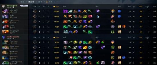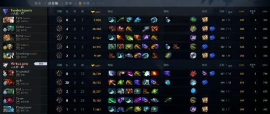 本场比赛Nine的中单光法同样发育十分迅速,虽然没有第一天13分钟10K经济那么夸张,但在前期也依然全场领跑,不过VP巧妙的规避了光法高伤害的强势期,并通过潮汐猎人限制住了狼人的节奏。在前期被针对的比较惨的灰烬之灵装备逐渐成型后,VP开始发起反攻,并通过团战一举控盾取得比赛优势。虽然Tundra依靠牛头的控制和光法的远距离输出多次击杀VP酱油,但却无法扭转正面团的颓势。VP稳扎稳打,没有给到再给到Tundra翻身的机会,成功取得第一局的比赛胜利。