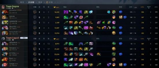 液体对线期双核打出巨大优势,双双无解肥。7分钟经济便领先了3K,随后一直保持着节奏的压制,三核经济全场领先。加上阵容团战的优势没有给到帝国太多的反击机会,34分钟便带着25K的经济优势推上帝国高地,并团灭对手。帝国果断打出GG,液体先下一城。