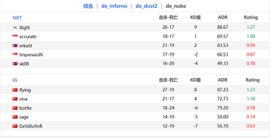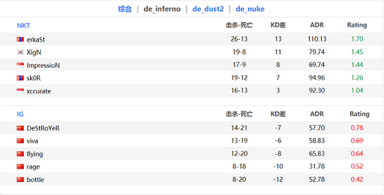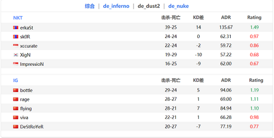 图一先来到NKT的选图Inferno,在首张地图上erkaSt表现亮眼,砍下了1.70的恐怖rating,IG并没能延续上场比赛的状态,反而是越打越找不到比赛的节奏,最终NKT在自己的选图上轻取IG。